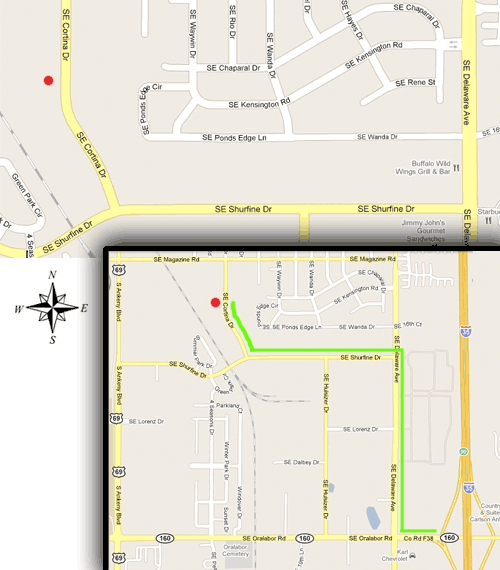 Turn north on S.E. Deleware Avenue. Turn West on S.E. Shurfine Drive. Turn North on S.E. Cortina.